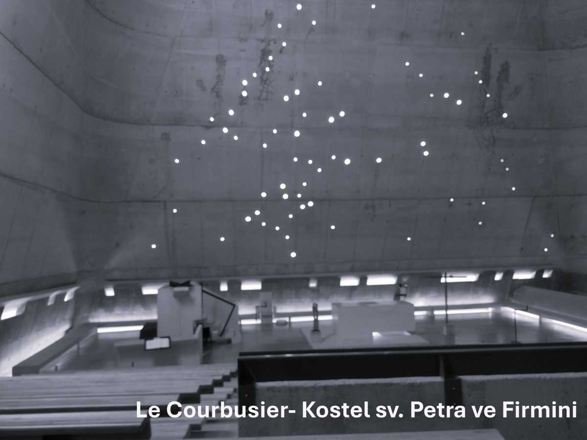 Dalším místem, které ve Firminy navštěvujeme je farní kostel a s ním spojené farní centrum sv. Petra. Od první chvíle jsme jím naprosto uchváceni. Le Courbusier dostal zakázku na kostel v r. 1961. V té době měl za sebou již realizaci poutního chrámu v Ronchamps a dominikánského konventu v La Tourette. Na projektu kostela ve Firminy pracoval s pomocí José Oubrerieho až do své smrti v roce 1965. Stavba kostela byla zahájena v roce 1973 pod vedením José Oubrerieho, ale v roce 1978 musela být přerušena. Práce byly obnoveny až v r. 2004. Budova kostela má tvar pyramidy se čtvercovou základnou, která přechází v komolý kužel. Je vysoká 33 metrů. Horní část tvoří betonová skořepina, která ukrývá hlavní loď a kapli pro všední dny. Spodní část se skleněnými fasádami slouží jako výstavní prostor. Loď kostela s výjimečnou akustikou a jedenáctisekundovým ozvěnou mění svůj vzhled v závislosti na denním světle. Ráno vnitřní prostor osvětluje souhvězdí Orionu vyřezané do fasády za oltářem. V poledne a pozdě odpoledne paprsky slunce pronikající těmito průhledy vytvářejí „světelné kanóny“ odrážející se na stěnách a podlaze, což je typické pro Le Courbusierovu architekturu. Fascinuje mne Le Courbusierův cit pro duchovní funkci prostoru. Jsme v katolickém kostele, tedy v prostoru, který by měl vyjadřovat kaloticitu spirituality. Tedy její všeobecnost, všezahrnující náruč, což je původní význam řeckého termínu καθόλου (kathólou). Souhvězdí Orionu Le Courbusier nezvolil náhodně na základě nějaké osobní preference nebo esoterického pocitu. Souhvězdí Orionu pro něj dokonale vyjadřuje katolicitu tím, že se nachází na nebeském rovníku, díky čemuž je alespoň jeho část viditelná z celého světa. Jak geniální, přitom jednoduché a funkční vyjádření všeobecnosti!