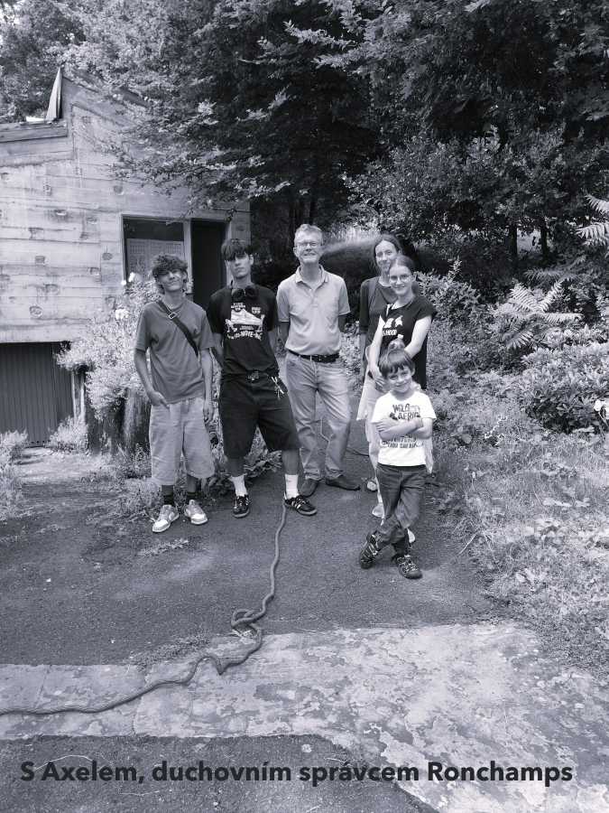V půjčených autech se vydáváme konečně do Luxeuil. Slunce se sklání k horám. Najednou vidím odbočku na Ronchamps. Má to být překvapení, o kterém nikdo z rodiny neví. Odbočuji a brzy vidíme ikonickou střechu Le Courbusierovy poutní kaple Panny Marie du Haut. Je dávno zavřeno. Rozhodnu se, že přelezu plot. Děti se téměř bez váhaní přidávají. Terezka dlouho otálí. Nakonec převáží vědomí, že je tak blízko a že se podobná příležitost vidět jednu z nejikoničtějších staveb moderní, a zejména moderní sakrální architektury, nemusí opakovat. Slunce ztrácí sílu, ale stále ještě ozařuje a zahřívá kopec s kostelem. Vše se noří do sytě zlatavého světla. Procházíme se po areálu a tváříme se jako jeho naprosto samozřejmá součást. Cítíme narůstající vzrušení z vědomí, že jsme toho součástí, že vše vidíme na vlastní oči. Terezku najednou osloví neznámý muž. „Kde jste se tu vzali?“ Terezka rozpačitě hledá slova. Já jsem od ní nějakých třicet metrů. „Přeskočili jste plot?“. Terezka špitne omluvně „Ano“. To už se blížím a snažím se vše objasnit. Muž se představí: „Jsem místní kněz Axel Isabey“. Pozve nás k sobě domů. Žije v malém domečku, který je postaven dle plánů Le Corbusiera, který do něj navrhl i interiér a židle. Téměř veškerý nábytek, mozaikovou podlahu a lampy navrhla Le Corbusierova spolupracovnice Charlotte Perriand. Axel má všude knihy o moderním umění. Rozhovor plyne přátelsky a zaujatě. Axel se zajímá o vztahy mezi vírou a uměním. Současně ho zajímá vazba mezi biblistikou a uměním. Nabídne nám, ať za ním druhý den přijdeme s tím, že nemusíme platit, stačí říct, že jsme přátelé. Všichni, včetně dětí, máme pocit úžasu, jako bychom se ocitli rázem ve světě za oponou, jako by se vše mávnutím kouzelného proutku proměnilo. Tato dvě setkání zcela pohltila úzkost, obavy a bezmoc předchozího trápení. Je nám téměř dokonale dobře. Kormidlo našeho putování převzal opět „někdo“ jiný. Sama cesta. Režie nám vypadla z rukou nebo jsme ji s důvěrou odložili stranou a nechali se „spolunést“ rytmem, který před námi vytanul.