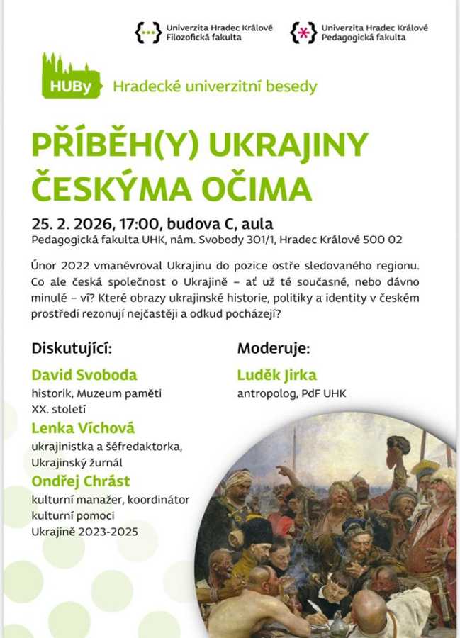 Několik momentek z veřejné debaty „Příběh(y) Ukrajiny českýma očima“, kterou moderoval Luděk Jirka. Hosty byli David Svoboda, Lenka Vichová a Ondřej Chrást. Akce byla pořádána ve spolupráci PdF a FF UHK.